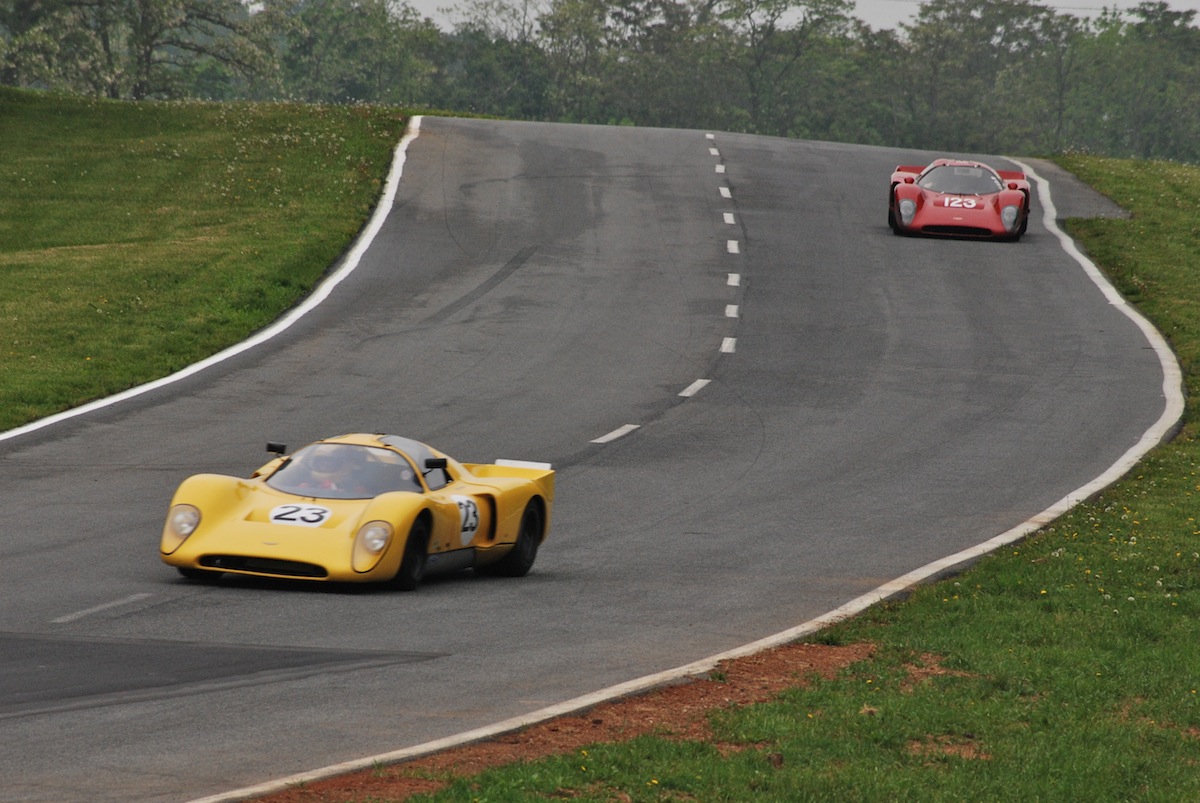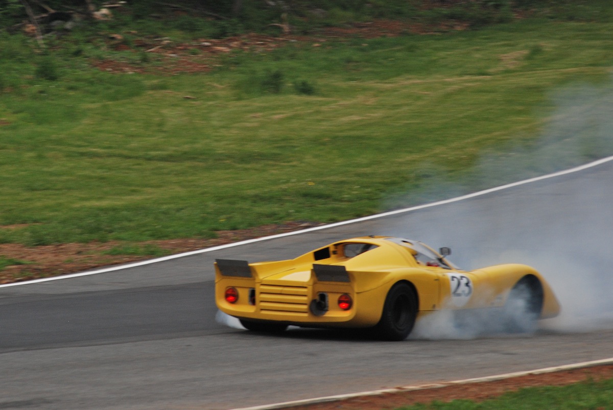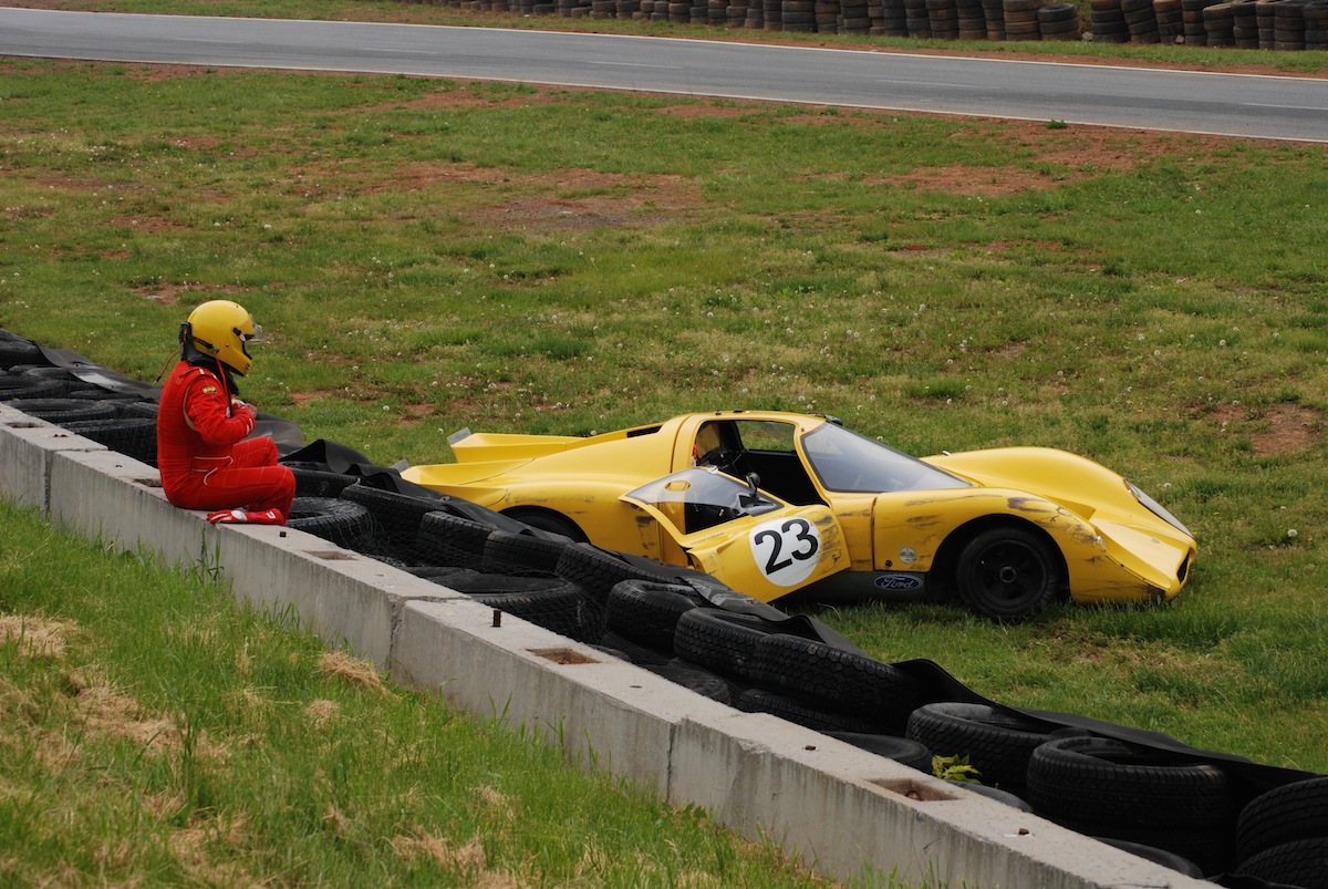 The afternoon endro races were extremely competitive…and for a portion of the Brian Redman Enduro I could swear I was taken back to 1969 and the good old days of the International Championship for Makes Series. For approximately 40 minutes I watched two 1969 Chevron B16’s battle each other lap after lap. It was intense to say the least. In the end, the combination of wet grass and the desire not to be over-taken took the yellow # 23 out of contention. Fortunately, driver Ralph Manaker, of Middleburg, VA escaped injury though he was dazed from the impact.