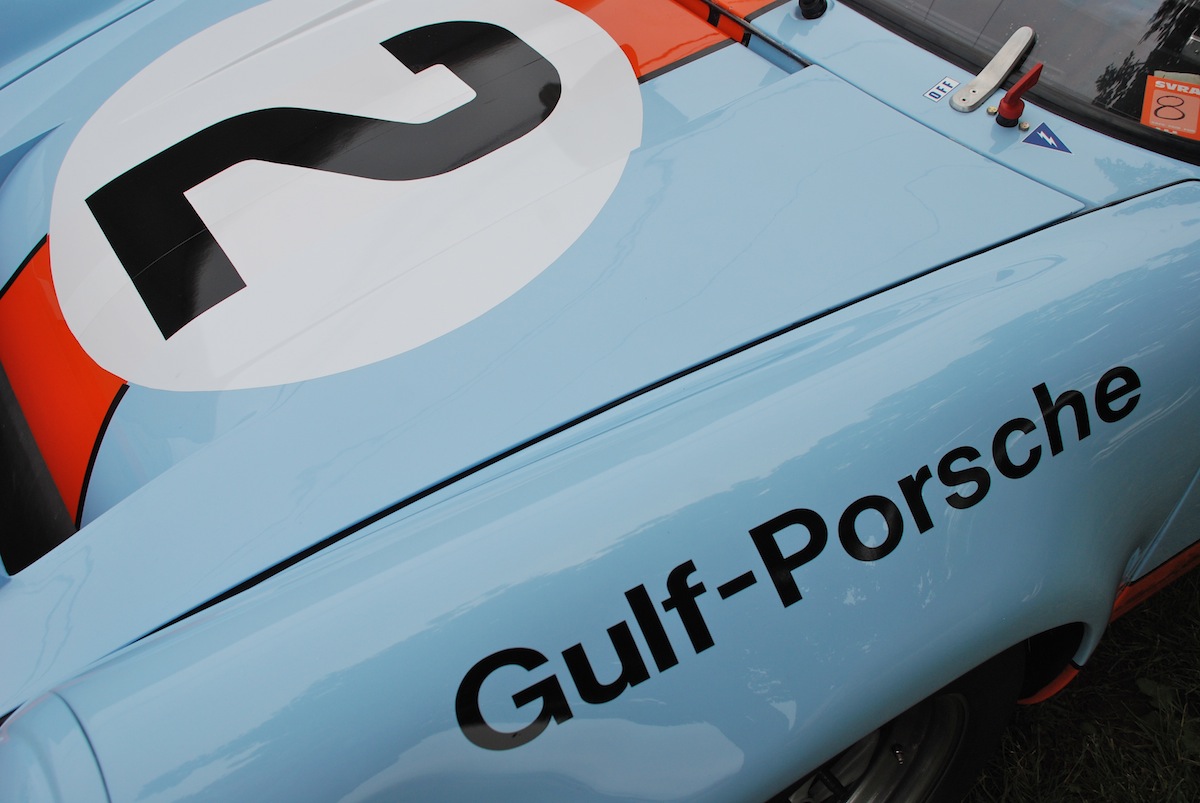 The classic Gulf-Porsche livery on display with the 1969 Porsche 911S (#2) of Bill Bauman (Toledo, OH).