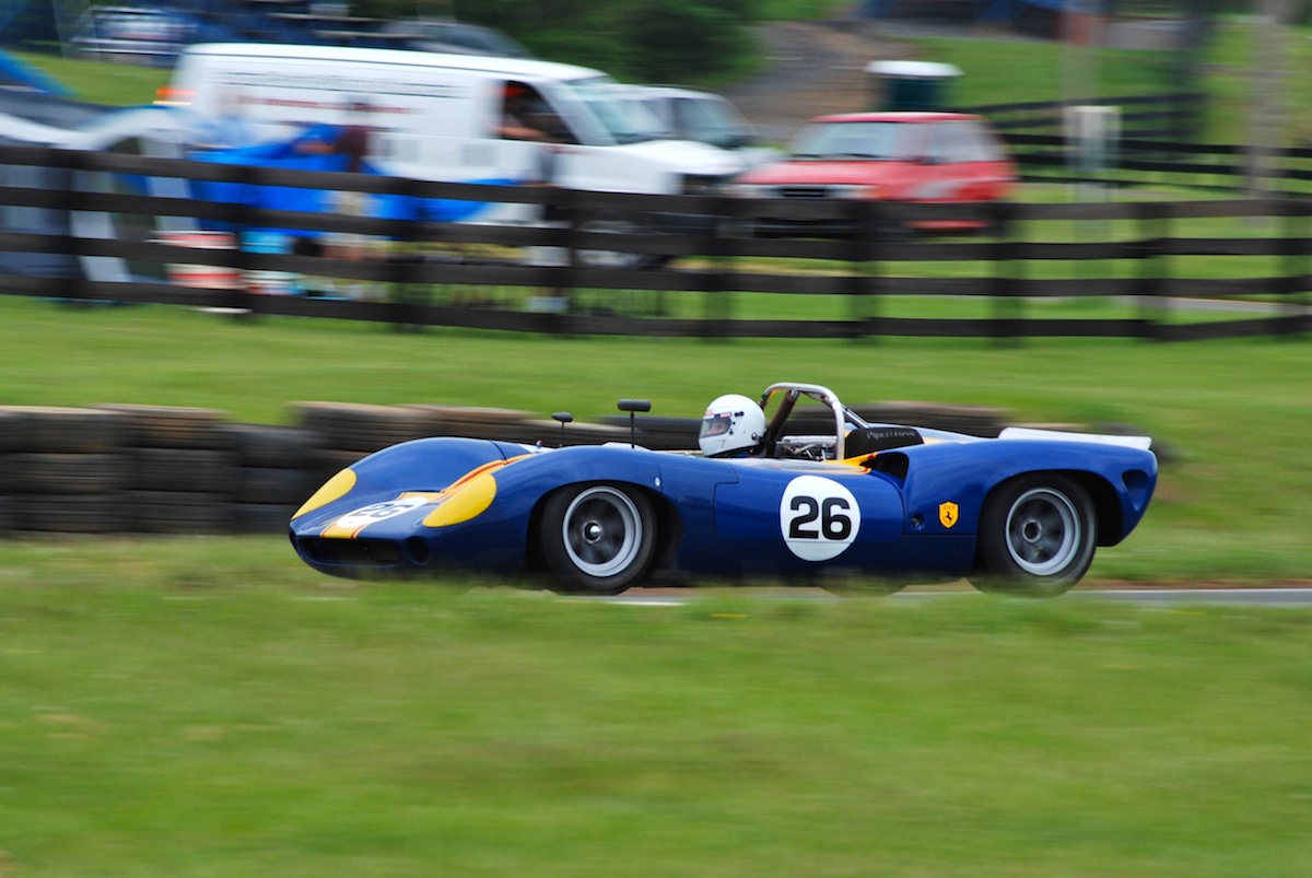 In my opinion, I was now looking at one of the most stunning cars that took to the track this weekend. Paul agreed to speak with me about his 1965 Lola T70 Roadster (#26). Its simple blue and gold livery beautifully captured the classic lines of this legendary car make and model. Paul noted that he has had a love affair with the Lola T70 since he saw its sister car compete in 1966 Can-Am at Bridgehampton, with John Surtees behind the wheel. This particular car competed in the 1966 USRRC, winning the Riverside Grand Prix with Buck Fulp behind the wheel. Fulp almost won the 1966 championship in this car, but a clutch failure at Elkhart Lake stood in the way.