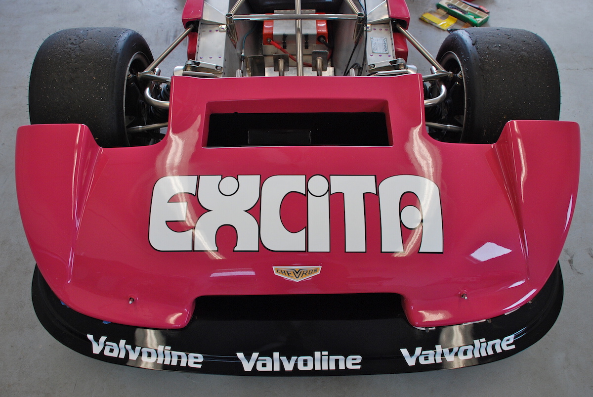 The car then went back to Chevron and was purchased by Jim Crawford. He raced the car in the British Formula Atlantic Series, taking the title in 1979. Crawford then ran the car in the Aurora AFX Championship Series, which was basically a “run what ya brung” series. Impressively, Crawford won a race at Oulton Park that was run in the rain, and against some formidable competition. Later, Crawford sold the car to Vin Mulkey of Chevron. It then changed hands a few times and ultimately ended up in the possession of Simon Hatfield. Jeff brought the 1978 Chevron B45 (chassis #4) back to the US and has restored it to the 1978 specifications. That includes the vivid pink livery with the EXCITA (condom company) logo brand, which made the car (then and now) very distinguishable from the other competitors.