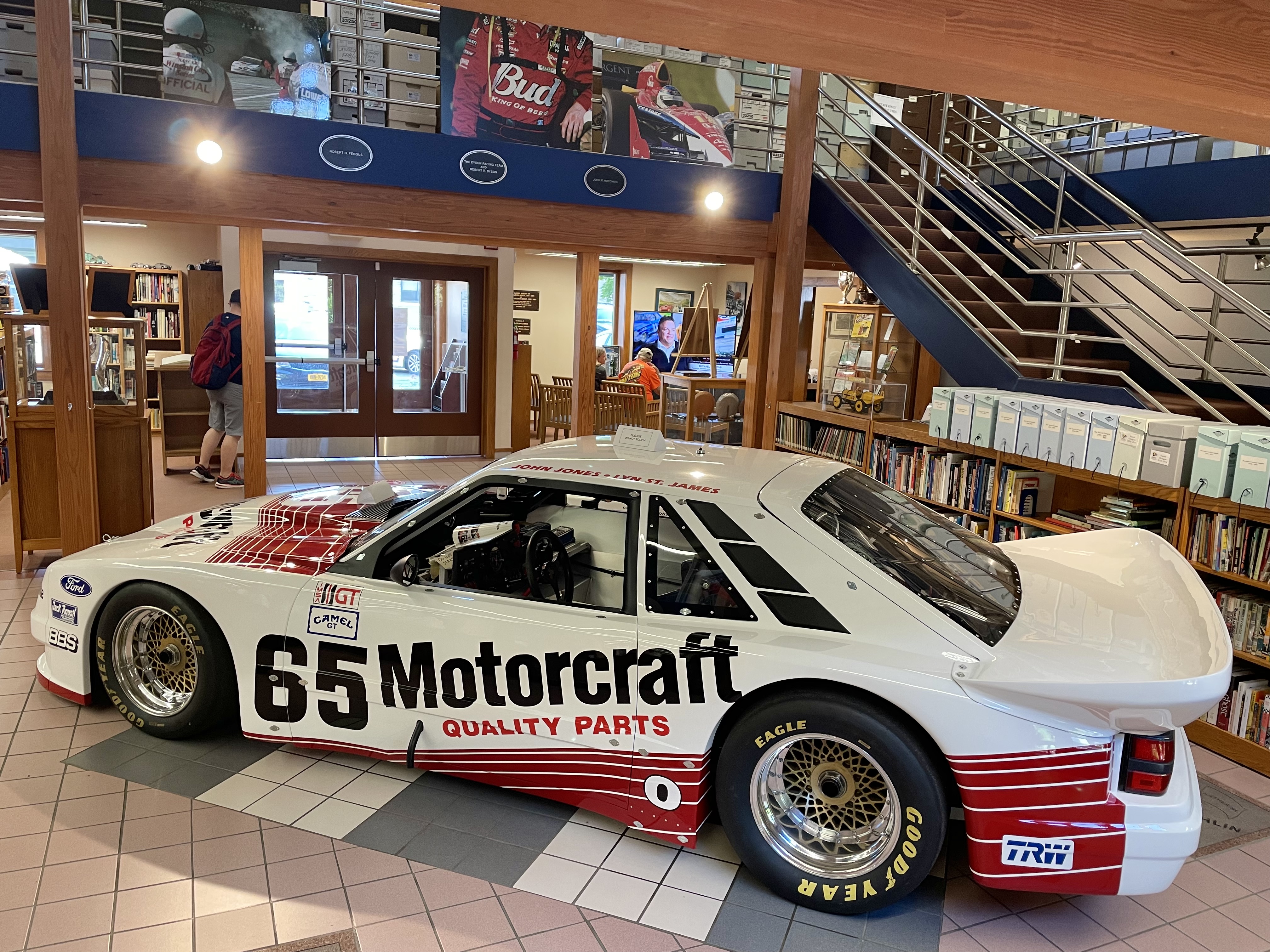 Mark said his was a roundabout path in becoming Executive Director. He graduated from Syracuse University in 2000 with a master’s degree in Library Science. While at the track in 1998 for an event Mark heard about the creation of the research center and learned that it was part of the Watkins Glen Public Library. He saw this as a great opportunity and was able to fulfill his internship at the library. It was such a great fit that he stayed for eight years working at IMRRC. Mark described this period of his career as his most fulfilling. Later he saw the opportunity to return and was selected to his current position as Executive Director in 2021. Mark described his duties as being responsible for the general oversight of day-to-day operations. That puts in mildly, for the scope and depth of IMRRC’s holdings cover literally every aspect of motor racing both locally and internationally. Mark explained the research center is a library and archive, open to the public, providing research services to a wide audience. Along with its large collection of books, publications, and photographs there are exhibits of racing memorabilia, exciting historical films to view, all capturing the heritage of racing at Watkins Glen. There is also a racing car on display, ‘On The Grid’, in the center foyer. Throughout the year many historic cars have the honor of being placed center stage. The current car is a 1985 Mustang GTO, formerly driven by Canadian John Jones and Lyn St. James in IMSA competition.