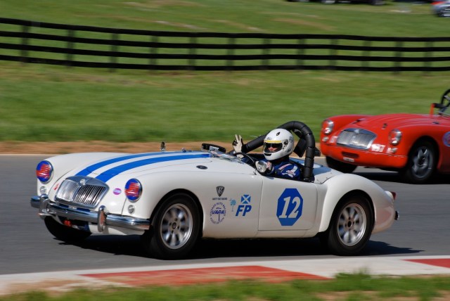Saturday’s featured event was the “British Invasion” race for Groups 1, 3, & 4. The race was won by Max Heilmann (Kenton, OH), who piloted his immaculate white (#78) 1958 Jaguar XK150 to victory. Max noted the long straights are where his car was able to take advantage of its power and make-up time that may have been lost in the slower, more technical corners. Max also recalled that his car appeared on the cover of Victory Lane Magazine in approximately 1988, at the time bearing #1, while at a vintage event at Mid-Ohio. It’s still winning after all these years. Second place in the “British Invasion” feature race was Charles Guest (Greensboro, NC) who piloted his (#211) 1967 MG Midget. Third place belonged to Greg Miller (Richmond, VA), in his (#4) 1962 Morgan 4×4.