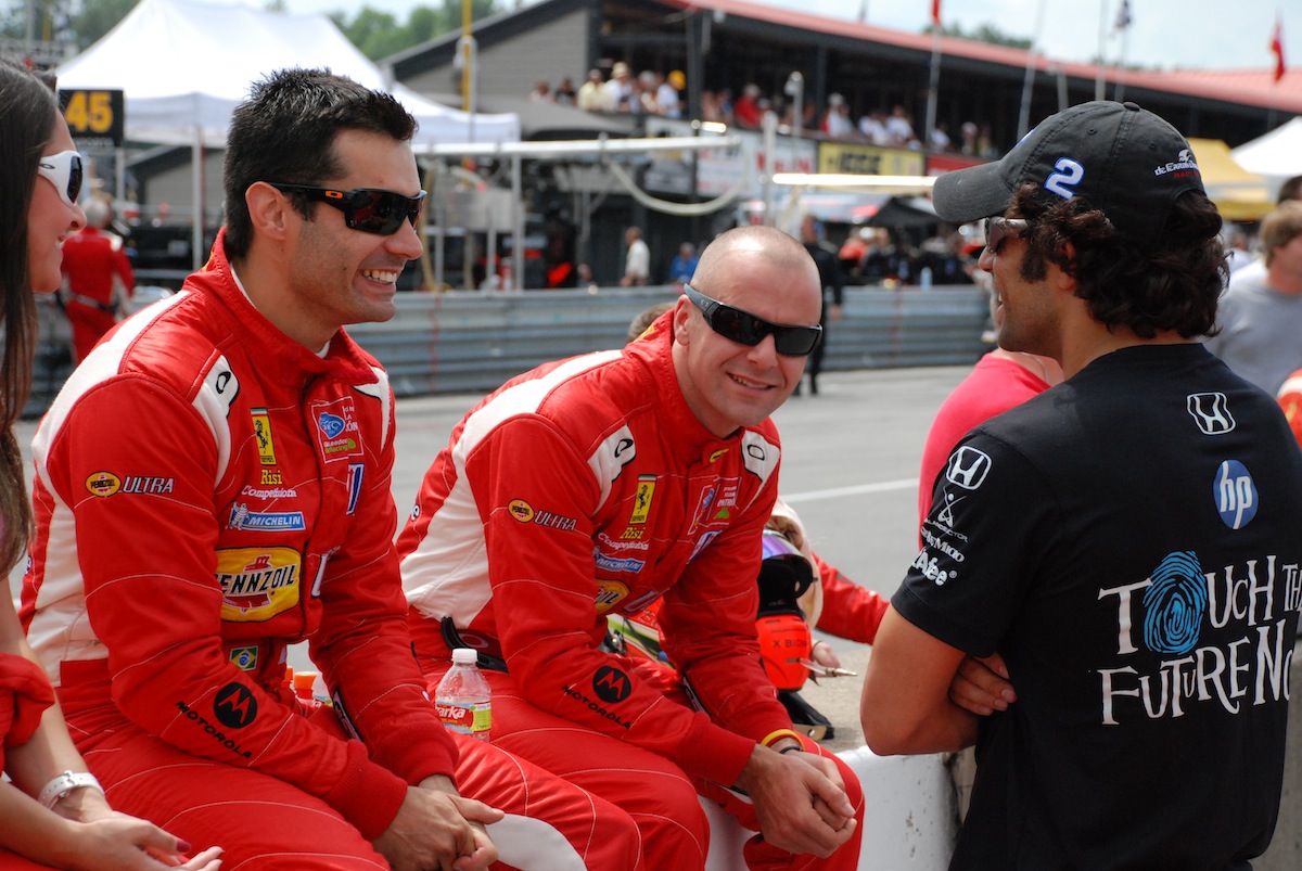 (left to right) Ferrari drivers Jaime Melo (Brazil) and Gianmaria Bruni (Italy) enjoy a light moment with IndyCar driver Raphael Matos (Brazil) during pre-race activities.